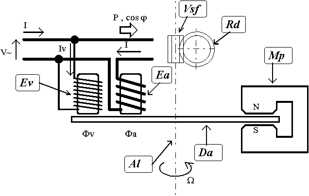 Per quanto riguarda il motore ad induzione, esso consta di uno statore formato da due elettromagneti a nucleo laminato Ev , Ea e di un rotore formato da un disco Da di materiale conduttore (lega di alluminio) calettato sull'albero Al del motore stesso.