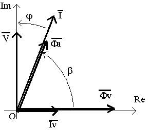 Se si trascurano la caduta di tensione nell'avvolgimento dell'elettromagnete voltmetrico, gli effetti trasformatorici derivanti dall'interazione elettromagnetica tra elettromagneti e disco e le perdite nei nuclei dei due elettromagneti si potranno ritenere i flussi sinusoidali Fv e Fa generati dagli elettromagneti in fase con le rispettive correnti sinusoidali Iv ed Ia . Con riferimento ad un utilizzatore ohmico - induttivo di sfasamento j , si potrà disegnare il seguente diagramma vettoriale: