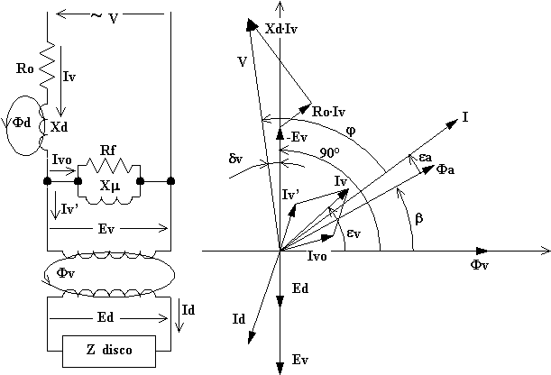 a) l'avvolgimento dell'elettromagnete voltmetrico non si comporta come un puro avvolgimento induttore in quanto in esso vi è una caduta di tensione causata dalla resistenza ohmica Ro del conduttore ed una caduta di tensione causata dalla reattanza di dispersione Xd originata dai flussi dispersi (quelli che non interagiscono col disco). Inoltre sono da considerare le perdite nel ferro che costituisce il nucleo dell'elettromagnete di cui si tiene conto con la resistenza fittizia trasversale Rf , l'assorbimento di corrente magnetizzante necessaria a sostenere il flusso utile di cui si tiene conto con la reattanza fittizia trasversale Xm e l'effetto trasformatorico che si stabilisce tra avvolgimento dell'elettromagnete (analogo al primario di un trasformatore) e disco (analogo al secondario di un trasformatore).