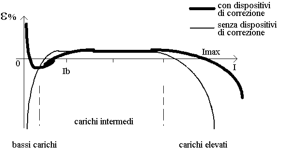 Per quanto riguarda il dispositivo di compensazione degli errori ai carichi elevati basti sapere che si tratta di un derivatore di flusso magnetico posto sul nucleo dell'elettromagnete amperometrico la cui azione è tanto più intensa quanto più è elevata la corrente di carico.