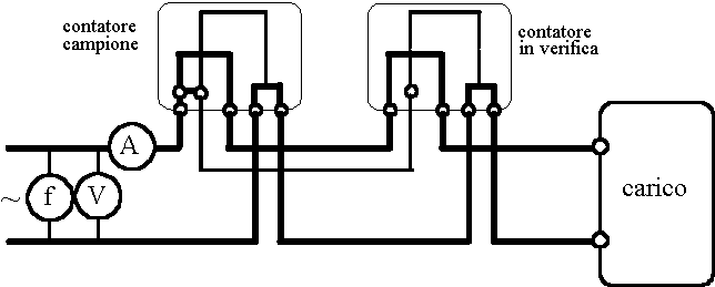 Si collegano il contatore campione e quello in verifica in modo che le rispettive voltmetriche siano sottoposte alla stessa tensione, cioè in parallelo, e le amperometriche siano percorse dalla medesima corrente, cioè in serie.