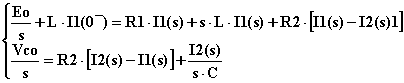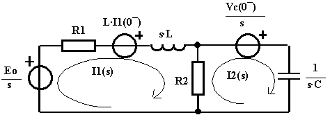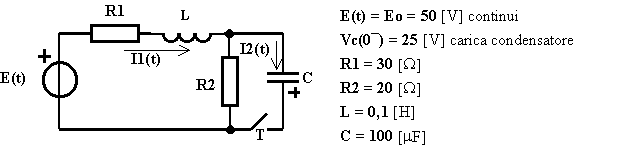 Alla chiusura del tasto T la rete può essere trasformata in quella topologicamente equivalente sotto riportata, nella quale si è tenuto conto delle condizioni iniziali non di quiete a causa della corrente circolante nell'induttore e della carica del condensatore presenti ancor prima di chiudere il tasto T: