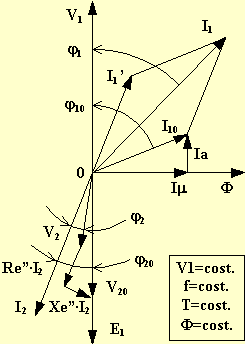 In tale diagramma j1 è lo sfasamento d'ingresso, j10 è lo sfasamento d'ingresso a vuoto, j2 è lo sfasamento d'uscita, j20 è lo sfasamento interno. Ovviamente lo sfasamento d'uscita coincide con l'argomento dell'impedenza di carico, cioè j2 = a . Lo sfasamento interno vale invece:
