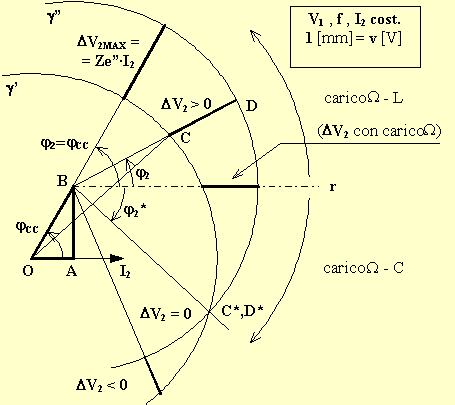 E' facile verificare che quando j2 = jCC si ha la massima c.d.t. industriale, pari alla caduta di tensione sull'impedenza equivalente secondaria. Quando lo sfasamento d'uscita, di natura Ohmico-capacitiva, è pari a j2* si ha una c.d.t. industriale nulla. Quando lo sfasamento d'uscita, di natura Ohmico-capacitiva, supera j2* si ha una c.d.t. industriale negativa, ovvero la tensione d'uscita a carico supera quella a vuoto.