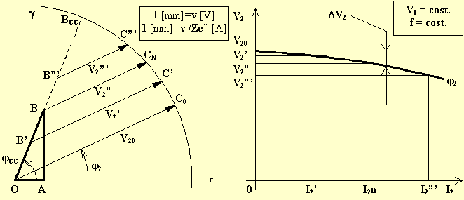 Sono le V2 = f(I2) con V1 = cost. , f = cost. , j2 = cost. e si possono ricavare analiticamente, noti che siano i parametri longitudinali del trasformatore, oppure graficamente basandosi sul triangolo fondamentale disegnato per la corrente nominale.