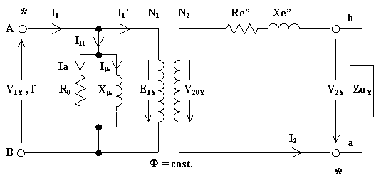 Al fine dei calcoli necessari per studiarne il comportamento (rendimento, c.d.t.i., ecc.), è possibile sostituire un trasformatore trifase, qualunque sia il tipo di collegamento degli avvolgimenti al primario ed al secondario, con un trasformatore equivalente Y/Y. Il circuito equivalente farà riferimento ad una sola fase in quanto il sistema è sicuramente simmetrico ed equilibrato (a carico, dovrà essere equilibrato l'utilizzatore alimentato dal trasformatore):