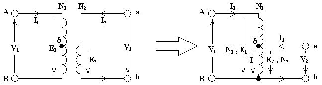 Disponendo di un trasformatore monofase riduttore avente un avvolgimento primario composto da N1 spire ed il secondario composto da N2 spire (N2 < N1) è lecito in ogni caso collegare un punto dell'avvolgimento primario con un punto dell'avvolgimento secondario, ad esempio il punto B col punto b , senza che il funzionamento del trasformatore vari. Essendo il numero delle spire primarie maggiore del numero delle spire secondarie si potrà trovare lungo l'avvolgimento primario un punto d che sia equipotenziale con il punto a del secondario. In tal caso è possibile collegare elettricamente il punto d con il punto a senza che venga alterato il funzionamento della macchina. L'avvolgimento di N2 spire risulta così superfluo, per cui si può realizzare il trasformatore con un unico avvolgimento: la macchina così realizzata prende il nome di autotrasformatore monofase.