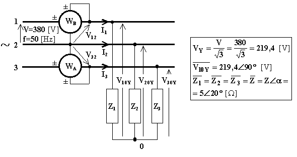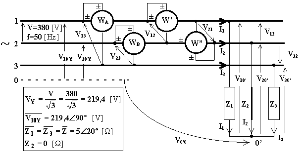 a) le tensioni applicate a ciascuna impedenza, le correnti di linea, le potenze attiva e reattiva complessive, le indicazioni di due wattmetri inseriti secondo Aron sui fili di linea 3 e 1;