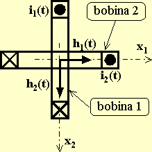 Le due bobine siano uguali e con gli assi x1 ed x2 fra di loro ortogonali. Le correnti di eccitazione delle bobine (e quindi i campi magnetici da esse originati) siano sinusoidali di eguale valore massimo ed eguale pulsazione, con i1(t) in quadratura in anticipo su i2(t). Il campo rotante che ne consegue ha intensità pari a: