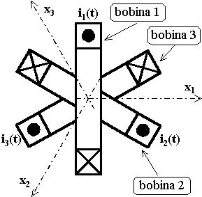 Le tre bobine siano uguali e con gli assi orientati a 120° tra di loro (con x1 in anticipo su x2 ed in ritardo su x3 ), le tre correnti sinusoidali (e quindi i corrispondenti campi magnetici) abbiano lo stesso valore massimo e la stessa pulsazione w ma siano sfasate tra di loro di un terzo di periodo, con i1(t) in anticipo su i2(t) ed in ritardo su i3(t).