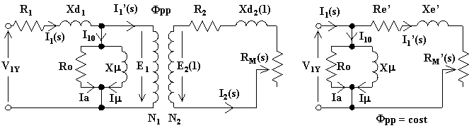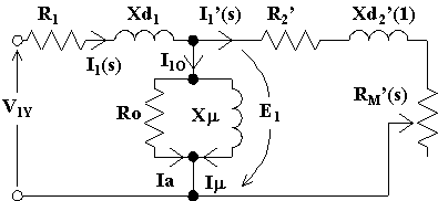 Se poi si trascura la c.d.t. nello statore, ovvero si ritiene la f.e.m. indotta nello statore E1 costante ed uguale alla tensione applicata V1Y , ovvero si suppone che la macchina funzioni a flusso per polo costante, si potrà trasportare i due rami trasversali a monte di tutto ed ottenere così il circuito equivalente semplificato ridotto a statore riportato sopra, per il quale: