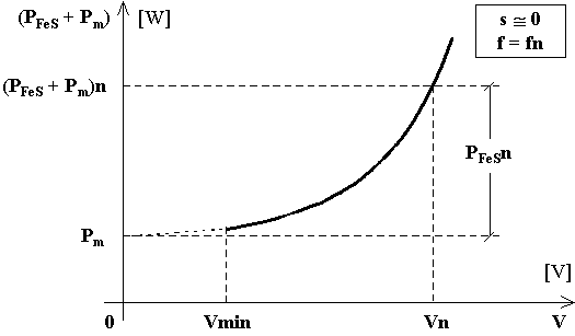 b) Metodo del motore a vuoto : dopo aver fatto la prova a vuoto a tensione Vn e frequenza nominali ed aver ricavato la somma delle perdite costanti (PFeS + Pm)n , si fa un'altra prova a tensione V' ridotta (comunque non ridotta in quantità tale da far ridurre in misura apprezzabile la velocità a vuoto del motore) rilevando le nuove perdite (PFeS + Pm)' . Siccome le perdite meccaniche sono legate solo alla velocità di rotazione, esse rimarranno costanti e pari a Pm , mentre le perdite nel ferro, a valori bassi di saturazione, sono proporzionali al quadrato della tensione, si potrà scrivere: