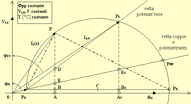 d) al variare dello scorrimento sicuramente variano sia le perdite nel ferro di rotore PFeR che le perdite meccaniche Pm , più precisamente le PFeR aumentano mentre le Pm diminuiscono all'aumentare dello scorrimento. Nel diagramma circolare, invece, si assume costante la somma (PFeS + PFeR + Pm) riassunta dal segmento B__A. Tale approssimazione risulta accettabile considerando la variazione di segno opposto per le perdite suddette.