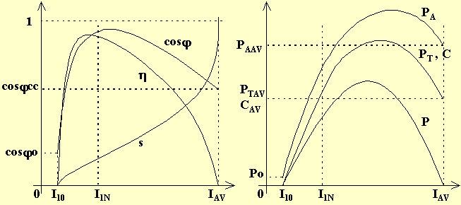 Si osserva come, in un motore correttamente dimensionato, la corrente di funzionamento nominale I1N si collochi in modo tale da realizzare condizioni prossime a quelle di massimo rendimento e massimo fattore di potenza, oltre a permettere un più che considerevole sovraccarico di coppia. Risultano ovvi i motivi di tale scelta.
