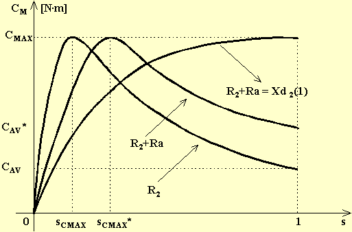 dalla quale si deduce che per aumentare la coppia di spunto è necessario aumentare la resistenza rotorica. A ciò provvede il reostato di avviamento inserito in serie a ciascuna fase rotorica grazie al quale la resistenza per fase rotorica assume il valore R2* > R2 . L'effetto di una maggiore resistenza rotorica è quello di fare aumentare lo scorrimento per il quale si ha la massima coppia mantenendo invariata la coppia massima. Per avere la massima coppia proprio all'avviamento bisogna rendere R2* = Xd2(1) e pertanto si dovrà disporre un reostato di resistenza Ra = Xd2(1) - R2 . Se invece si desidera dare luogo alla massima coppia in corrispondenza di un valore di scorrimento sCMAX* > sCMAX è facile verificare che sarà necessario un reostato di resistenza: