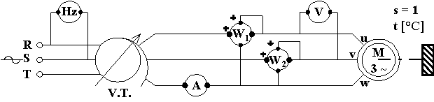 I due wattmetri servono a misurare la potenza assorbita dal motore. Si osserva che sono inseriti secondo Aron, questo perché il motore funzionante a rotore bloccato costituisce un sistema equilibrato. Inoltre, siccome il f.d.p. per un motore in cortocircuito è piuttosto basso (anche se non come quello a vuoto), ci si deve attendere un'indicazione negativa dal secondo wattmetro.