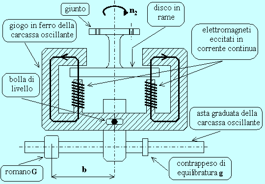 Si tratta di un freno elettromagnetico. L'estremità dell'albero del motore in prova viene rigidamente accoppiata, mediante un giunto, ad uno spesso disco di rame la cui periferia è attraversata dal flusso uscente dai poli di due o più elettromagneti (eccitati in corrente continua perché, a parità di corrente e quindi di campo prodotto, è richiesta l'applicazione di una minore tensione e perché il campo magnetico costante non determina perdite nel ferro del giogo della carcassa oscillante). Il circuito magnetico di ciascun elettromagnete è chiuso attraverso un giogo di ferro che è montato e può oscillare su due coltelli d'acciaio come il giogo di una bilancia; al giogo è solidale un'asta graduata ed una bolla di livella (il tutto costituisce la carcassa oscillante del freno). Mediante la regolazione di un opportuno contrappeso di equilibratura g , il sistema oscillante viene preventivamente equilibrato in modo da portarne il baricentro appena sotto l'asse di rotazione determinato dai coltelli: in queste condizioni il peso mobile (romano) G deve trovarsi sullo zero della scala graduata sull'asta orizzontale che costituisce il braccio della bilancia e la bolla di livella deve essere sul centro.
