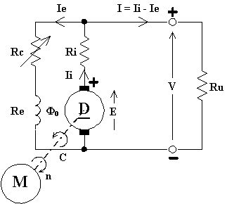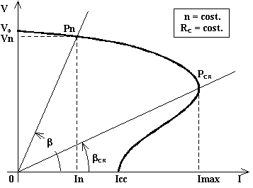 La caratteristica esterna V = f(I) , per resistenza del reostato di campo e velocità di rotazione costanti, ha il primo tratto che non differisce di molto da quello già visto per la dinamo ad eccitazione indipendente, solo che ora si presenta con maggiore pendenza perché la tensione ai morsetti della macchina diminuisce all'aumentare della corrente erogata, oltre che per la reazione d'indotto e la caduta Ohmica sulla resistenza interna, anche perché diminuisce la corrente d'eccitazione cosicché si viene a determinare un ulteriore indebolimento del flusso induttore. Tale fenomeno aumenta mano a mano che la corrente di carico aumenta d'intensità fino al valore Imax di corrente erogata. Se, raggiunta tale corrente, si diminuisce ulteriormente il valore della resistenza di carico, succede un fenomeno inconsueto: la corrente erogata diminuisce anziché aumentare e la tensione d'uscita si abbassa molto rapidamente fino a diseccitare la macchina. Tutto questo accade perché la corrente di eccitazione è diventata insufficiente a causa del forte abbassamento della tensione d'uscita. Infatti la corrente d'eccitazione è derivata in parallelo dalla tensione d'uscita e la sua diminuzione comporta una diminuzione del flusso e, quindi, della tensione d'uscita stessa: in pratica il fenomeno si esalta portando alla totale diseccitazione della macchina anche se dall'esterno non si è ulteriormente ridotta la resistenza di carico. Quindi il punto PCR sulla caratteristica esterna individua la retta di carico di pendenza bCR che costituisce il limite per la stabilità di funzionamento della dinamo. In definitiva non è possibile ridurre la resistenza del carico ad di sotto del valore RCR = tg(bCR).