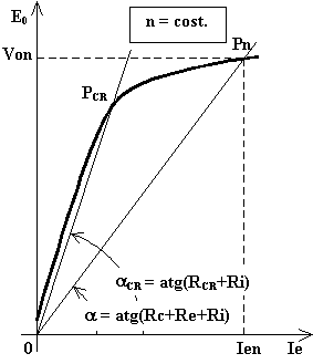 Nel funzionamento a vuoto é nulla la corrente I erogata verso il carico, quindi si ha una corrente d'indotto coincidente con quella d'eccitazione, Ii = Ie. Tale corrente è sempre piuttosto piccola, per tale motivo risulta trascurabile la reazione d'indotto e si può porre E @ E0. Il punto di lavoro nominale Pn sulla caratteristica di magnetizzazione E0 = f(Ie) viene individuato dall'intersezione della retta E0 = (Rc + Re + Ri)·Ie con la caratteristica stessa e si situa normalmente dopo il ginocchio. E' fondamentale che il punto di lavoro non cada nel tratto rettilineo della caratteristica di magnetizzazione, infatti, se questo si verificasse, si avrebbero inaccettabili variazioni della tensione d'uscita anche per piccolissime variazioni del valore del reostato di campo Rc. Quindi esiste un punto di lavoro critico PCR a sinistra del quale non si deve andare e ciò impone un valore massimo alla resistenza complessiva (Rc + Re + Ri):