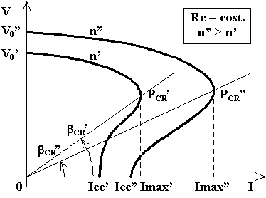 Si può affermare che il funzionamento della dinamo è stabile nel tratto di curva che va dal punto di funzionamento a vuoto (Ru = ¥, I = 0,V = V0) al punto PCR, mentre è instabile nel tratto che va da PCR al punto di funzionamento in cortocircuito (Ru = 0, I = Icc, V = 0). In una macchina correttamente dimensionata il punto nominale di funzionamento si colloca come Pn in figura.