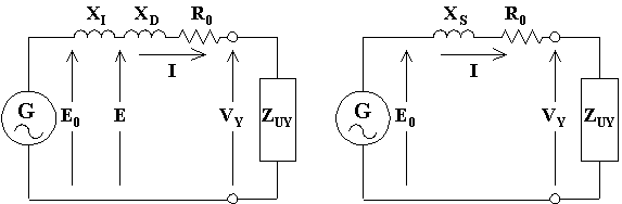 In definitiva, il comportamento dell'alternatore potrà essere descritto attraverso il modello riassunto dal seguente circuito equivalente di Behn-Eschemburg (riferito ad una sola fase ed immaginando a stella il collegamento dell'indotto):