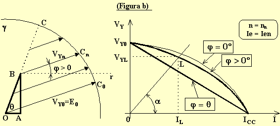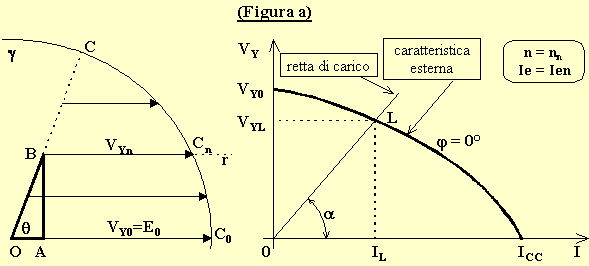 a) carico puramente Ohmico (figura a), ovvero j = 0°. Si nota come la caratteristica esterna sia incurvata e cadente. Per I = 0 [A] si ha il punto di funzionamento a vuoto, per VY = 0 [V] si ha il punto di funzionamento in cortocircuito. Partendo dal funzionamento a vuoto si arriva a quello in cortocircuito facendo variare l'impedenza del carico da ¥ [W] a 0 [W]. Sovrapponendo la retta di carico alla caratteristica esterna si individua il punto di lavoro L coi relativi valori di tensione d'uscita VYL e corrente erogata IL. Nel funzionamento a vuoto è ovviamente VY0 = E0 [V], mentre nel funzionamento in cortocircuito è ICC = E0/ZS [A].