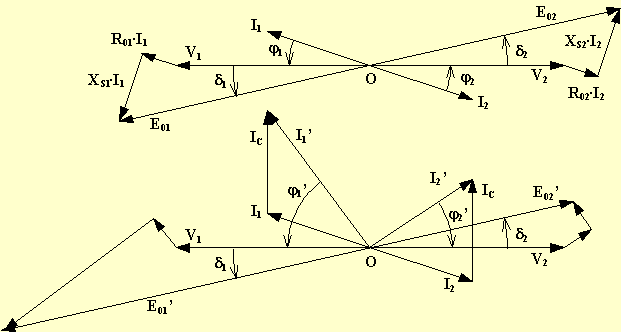 Affinché l'alternatore G2 eroghi potenza reattiva induttiva sappiamo che si deve aumentare la sua eccitazione. Se la richiesta di potenza reattiva in linea è rimasta invariata, di pari passo si deve diseccitare l'alternatore G1 perché rimanga invariata la tensione alle sbarre.