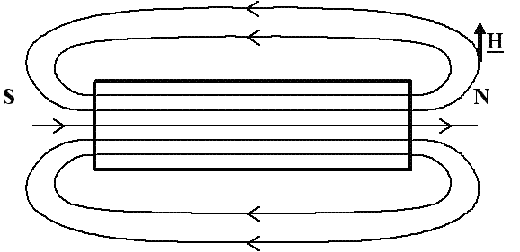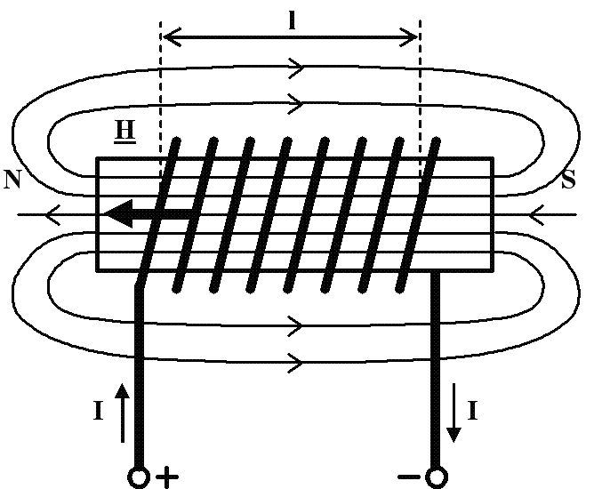 Consideriamo come ulteriore esempio un solenoide (avvolgimento avente forma di bobina), di lunghezza l molto maggiore del diametro, composto di N spire e percorso dalla corrente di intensità I . Per tale sistema si può dire che il campo all'interno è praticamente uniforme e di intensità H = N·I / l [A / m] .