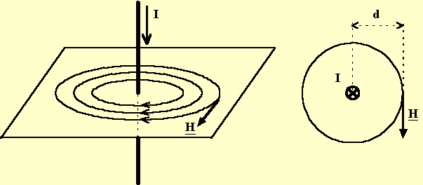 In un conduttore rettilineo percorso da una corrente di intensità I, il campo magnetico nello spazio circostante avrà le linee di forza come in figura e la sua intensità in un punto distante d dalla corrente varrà H = I / (2·p·d) [A /m] ( legge di Biot-Savart ).