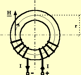 Infine consideriamo un solenoide toroidale la cui principale caratteristica è quella di contenere tutto il campo al proprio interno. Se N è il numero di spire, r è la lunghezza del raggio medio ed I l'intensità della corrente, sarà H = N·I / (2·p·r) [A / m] .