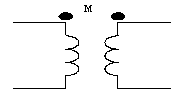 Nei circuiti elettrici il simbolo col quale si indica il mutuo accoppiamento è quello riportato nella figura sopra disegnata. I puntini neri posti ad una estremità di ciascuno degli avvolgimenti indicano i morsetti corrispondenti del componente, nel senso che il valore di M risulta positivo se la corrente in entrambi gli avvolgimenti entra nel morsetto contraddistinto dal puntino, negativo in caso contrario.