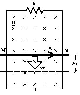 Quale esempio consideriamo quello del circuito di figura, costituito da tre lati indeformabili ed un lato MN di lunghezza l che può scorrere verticalmente. Supponiamo che tale movimento avvenga senza attrito. Sia R la resistenza complessiva de circuito. Il circuito sia concatenato con un campo magnetico di induzione B uniforme, le cui linee di forza siano perpendicolari ed entranti nel piano su cui giace il circuito. Si consideri il lato MN in movimento verso il basso con una velocità costante ve . Se all'istante t la posizione occupata dal lato in movimento è quella indicata a tratto pieno,dopo un intervallo di tempo Dt , e quindi all'istante (t + Dt) , la posizione occupata sarà quella indicata in tratteggio essendo lo spazio percorso Dx = ve·Dt . Nell'intervallo di tempo Dt , a causa dell'aumento della superficie del circuito intersecata dalle linee di campo magnetico, sarà aumentato il flusso concatenato di una quantità pari a DFc = B·l·Dx e, quindi, per la legge generale della induzione elettromagnetica si sarà sviluppata una f.e.m.i. di valore :