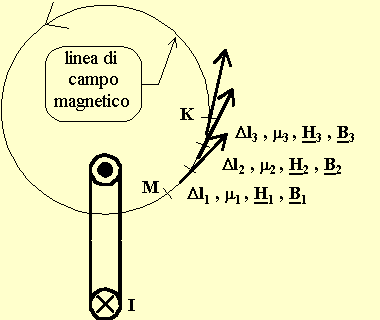 Si consideri una linea di campo magnetico e si individuino diversi tratti Dl per ciascuno dei quali si possano ritenere costanti la permeabilità magnetica, il campo magnetico e, quindi, l'induzione magnetica.