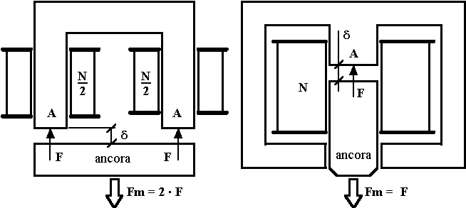 Passando alle due forme costruttive riportate sopra, indicando con I la corrente di eccitazione dell'elettromagnete, per l'elettromagnete di sinistra, trascurando le cadute di tensione magnetica nel ferro rispetto a quelle nel traferro si ha: