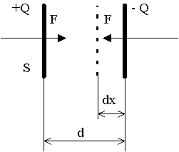 Facciamo riferimento ad un condensatore carico ed isolato, ovvero non collegato ad un circuito esterno . Indichiamo con d la distanza tra le sue armature, con S la superficie, con Q la carica, con V la differenza di potenziale e con e la costante dielettrica. Lasciata libera, l'armatura di destra tenderà a muoversi verso sinistra perché attratta dalla forza elettrica F dovuta alla carica di segno opposto distribuita sulle armature. Per non contraddire le condizioni di staticità del sistema, immaginiamo che a causa della forza F l'armatura compia uno spostamento infinitamente piccolo dx.