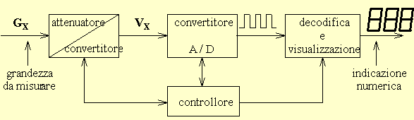 Si osserva che la grandezza da misurare GX viene convertita in un segnale continuo di tensione VX che, a sua volta, viene convertito in un segnale digitale binario (successione di bit) inviato infine alla sezione di decodifica e visualizzazione che avviene sotto forma numerica. Il tutto è gestito da un controllore, di solito costituito da un microprocessore. Il numero di cifre col quale viene fornita l'indicazione numerica dipende dall'accuratezza dello strumento, essendo inutile rappresentare cifre non significative (delle quali, cioè, non può essere assicurata la fondatezza). Tuttavia, molto spesso il numero visualizzato comprende una cifra in più rispetto all'accuratezza dello strumento, questo per rendere massima la risoluzione. Ad esempio, uno strumento col visualizzatore a cinque cifre e quindi con 100000 punti di misura (da 00000 a 99999) ha una risoluzione del visualizzatore pari a 1/100000 = 10-5 mentre la sua accuratezza potrebbe essere pari a 10-4.