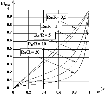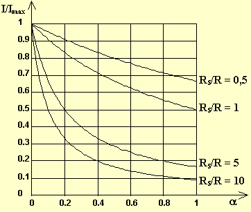 Il diagramma sopra riportato mostra la funzione I/Imax = f(a)