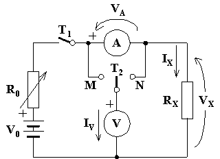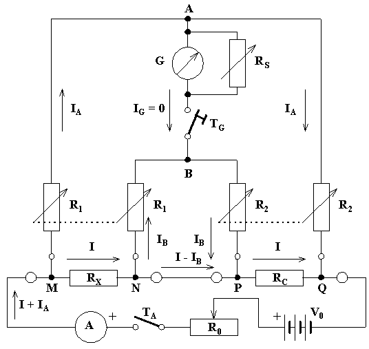 a) un circuito amperometrico composto da un generatore di f.e.m. V0, un reostato variabile R0 per regolare la corrente, un amperometro A per tenere sotto controllo la corrente stessa, un interruttore TA col quale si comanda l'inserimento o meno del generatore al circuito, le resistenze incognita e campione. Lo scopo di questo circuito è quello di alimentare in corrente le resistenze RX ed RC al fine di produrre le cadute di tensione VMN e VPQ che verranno confrontate attraverso il circuito voltmetrico. La corrente nel circuito amperometrico deve essere regolata su di un valore inferiore alla portata della resistenza campione, peraltro indicata sulla sua targa.