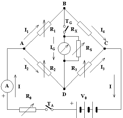 Si tratta di un circuito di misura a sei lati e quattro nodi adatto alla misura di precisione delle resistenze medie. Dei sei lati, uno è costituito dalla resistenza incognita RX, tre da altrettante resistenze di precisione tarate, di cui almeno una variabile, mentre gli altri due sono rappresentati rispettivamente da un galvanometro magnetoelettrico (sulla diagonale di rivelazione) e da un generatore costituito da una pila o da un accumulatore (sulla diagonale di alimentazione).