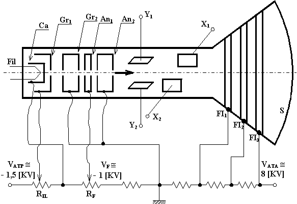 Il fascio catodico, deviato dal sistema di placche, viene ulteriormente accelerato dalle fasce intensificatrici FI1, FI2, FI3 a potenziale via crescente.