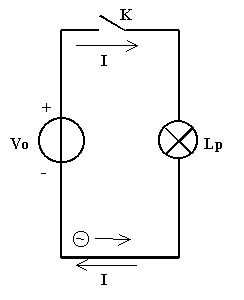 Con Vo è indicato il generatore (più precisamente la sua forza elettromotrice), con K è indicato l'interruttore e con Lp è indicata la lampada ad incandescenza. I conduttori di collegamento sono rappresentati mediante delle linee continue e senza alcuna indicazione letterale, questo perché nella trattazione semplice che stiamo facendo li supponiamo ideali (ovvero capaci di condurre la corrente elettrica senza che questa incontri alcuna resistenza al suo avanzamento). Quando l'interruttore è aperto (come in figura) il circuito è interrotto e si dice che il sistema è a riposo. Quando l'interruttore è chiuso si dice che il sistema è attivo ed è questa la condizione che ci interessa discutere. Il generatore separa al suo interno la carica elettrica positiva da quella negativa, concentrando la prima sul suo polo positivo e la seconda sul suo polo negativo. Siccome le cariche di uguale segno tendono naturalmente a respingersi, il generatore è obbligato a compiere un lavoro e quindi necessita di energia (nel nostro caso energia chimica, che col trascorrere del tempo tenderà ovviamente ad esaurirsi), a lavoro compiuto (cioè a cariche separate) tale energia si sarà tramutata in energia potenziale elettrica posseduta dalle cariche accumulate ai poli. Le cariche accumulate sui poli tenderanno a ricombinarsi attraverso il circuito esterno al generatore visto che l'interruttore è chiuso, quindi considerando che il conduttore metallico permette il solo passaggio degli elettroni (cariche negative), avremo un flusso ordinato di cariche negative (elettroni) che circoleranno in senso antiorario nel circuito costituendo così la corrente elettrica. E' tuttavia bene introdurre fin da ora una importante convenzione adottata nei sistemi elettrici: la corrente elettrica è definita come un flusso ordinato di carica elettrica positiva, quindi, anche se in realtà a spostarsi sono gli elettroni (carica negativa), si ragionerà sempre e soltanto sulla carica positiva. Allo scopo basta applicare un piccolo artificio che consiste nel considerare, invece del flusso di elettroni, un flusso uguale ma opposto di carica elettrica positiva. Adottando tale convenzione diremo che la carica accumulata sul polo positivo del generatore circola in senso orario nel circuito per ricombinarsi con la carica negativa che si trova sul polo opposto e così facendo sostiene la corrente elettrica I. La carica elettrica attraverserà l'utilizzatore Lp e nell'attraversamento perderà l'energia elettrica potenziale che si trasformerà in altra forma, nel nostro caso in calore che porterà all'incandescenza il filamento della lampadina determinando quindi l'emissione di radiazione luminosa. Una volta che la carica positiva avrà raggiunto, grazie al circuito esterno, il polo negativo del generatore, il generatore stesso provvederà a ricondurla al polo positivo fornendole nuova energia potenziale elettrica e consumando nel compiere tale lavoro una parte dell'energia chimica posseduta. Quanto descritto continuerà nel tempo fin tanto che non verrà riaperto l'interruttore oppure fin tanto che non si sarà esaurita l'energia chimica posseduta dal generatore (pila chimica). Vi è una stretta relazione tra la quantità di carica elettrica che si muove nel circuito, la forza elettromotrice del generatore ed il lavoro compiuto (sia quello speso nel generatore che quello utile eseguito nell'utilizzatore), più precisamente la forza elettromotrice del generatore rappresenta il lavoro che può compiere un coulomb di carica elettrica separata sui suoi poli.