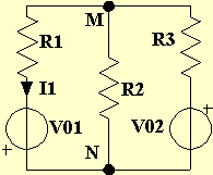 Vediamo ora un esempio di applicazione del teorema di Millman. Nella rete di figura ( R1 = 1 [W] , R2 = 2 [W] , R3 = 3 [W] , V01 = 100 [V] , V02 = 200 [V] ), si debba determinare la corrente circolante, con verso dall'alto al basso, nella resistenza R1.