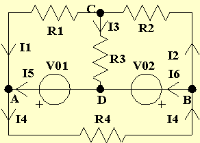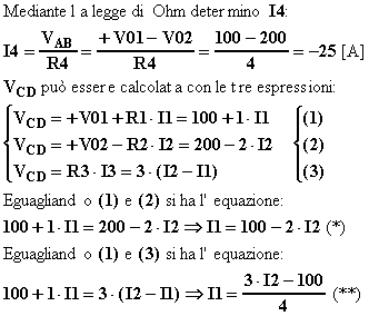 presenta una curiosità, infatti i valori di R1 , R2 , R3 non influiscono sul valore della corrente attraverso R4. Questo perché la tensione tra i nodi A e B è vincolata dai due generatori ideali di tensione al valore VAB = +V01 - V02.