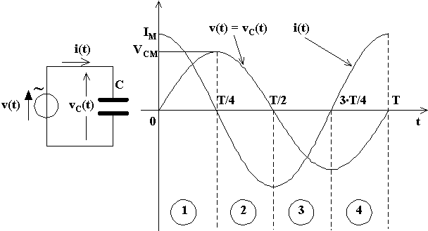 Nel primo quarto di periodo (1), avendosi un intervallo di carica la tensione aumenta positivamente da zero al valore massimo VCM , il condensatore deve corrispondentemente assorbire una corrente di carica positiva, la quale parte dal suo valore massimo IM e va poi gradatamente diminuendo fino a ridursi a zero nell'istante in cui il condensatore raggiunge il suo stato di massima carica.