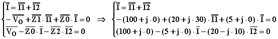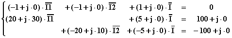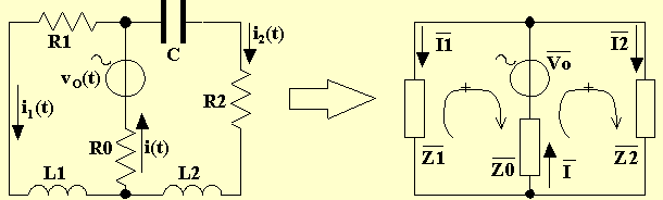 Ora assegniamo il verso alle correnti nei tre rami (che dovrà essere lo stesso nel circuito di partenza e nel circuito alle impedenze), quindi assegniamo il verso alle due maglie contigue e scriviamo il sistema risolvente applicando il primo principio di Kirchhoff al nodo superiore ed il secondo principio alle due maglie contigue: